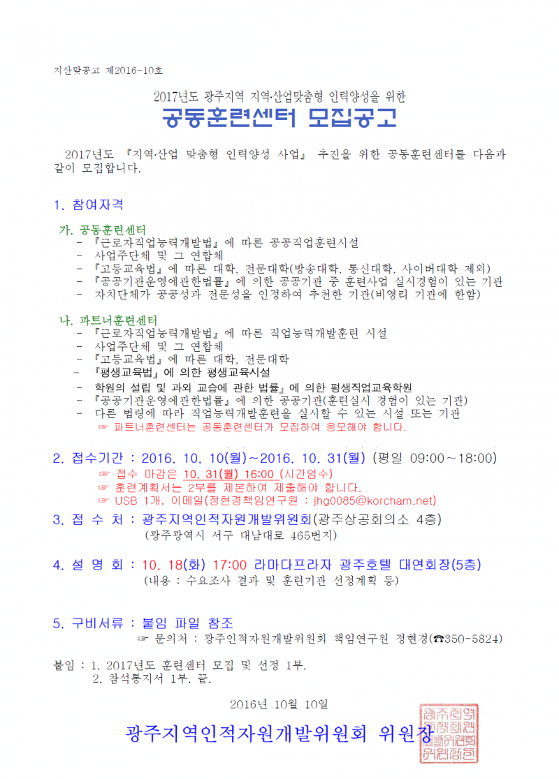 [제2016-10호] 2017년도 광주지역 지역․산업맞춤형 인력양성을 위한 공동훈련센터 모집공고