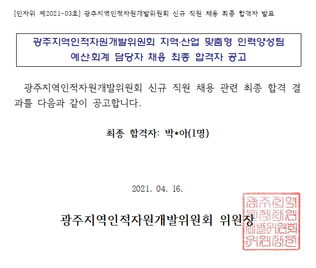[인자위 제2021-03호] 광주지역인적자원개발위원회 신규 직원 채용 최종 합격자 발표
