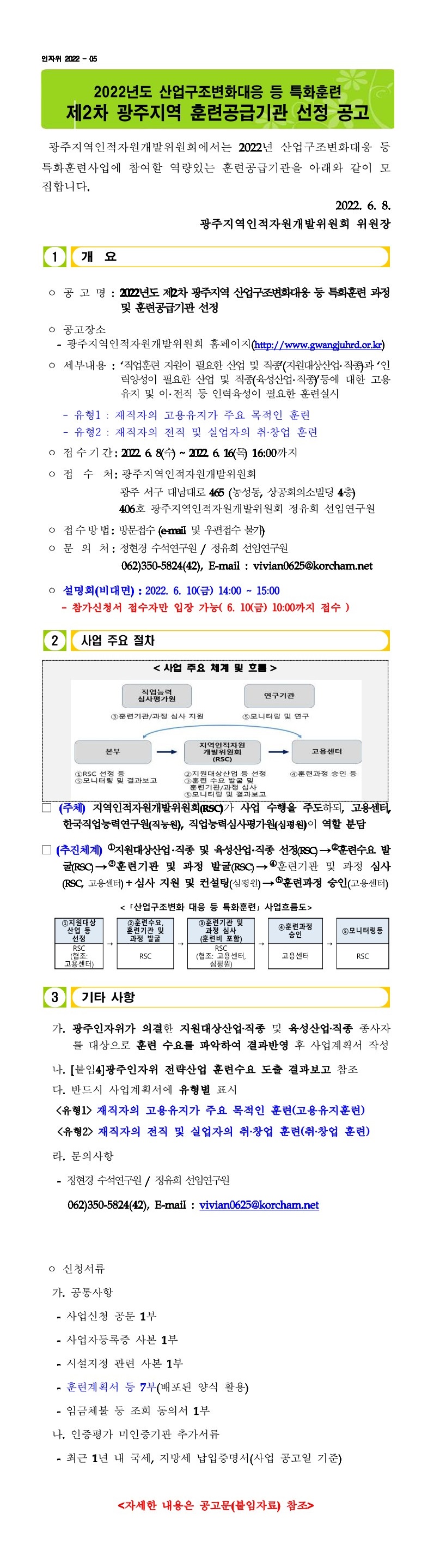 [인자위 2022-5호] 2022년도 산업구조변화대응 등 특화훈련 제2차 광주지역 훈련공급기관 선정 공고