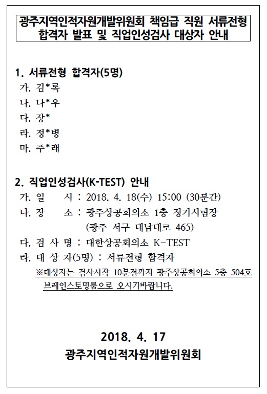 광주지역인적자원개발위원회 책임급 직원 서류전형 합격자 발표