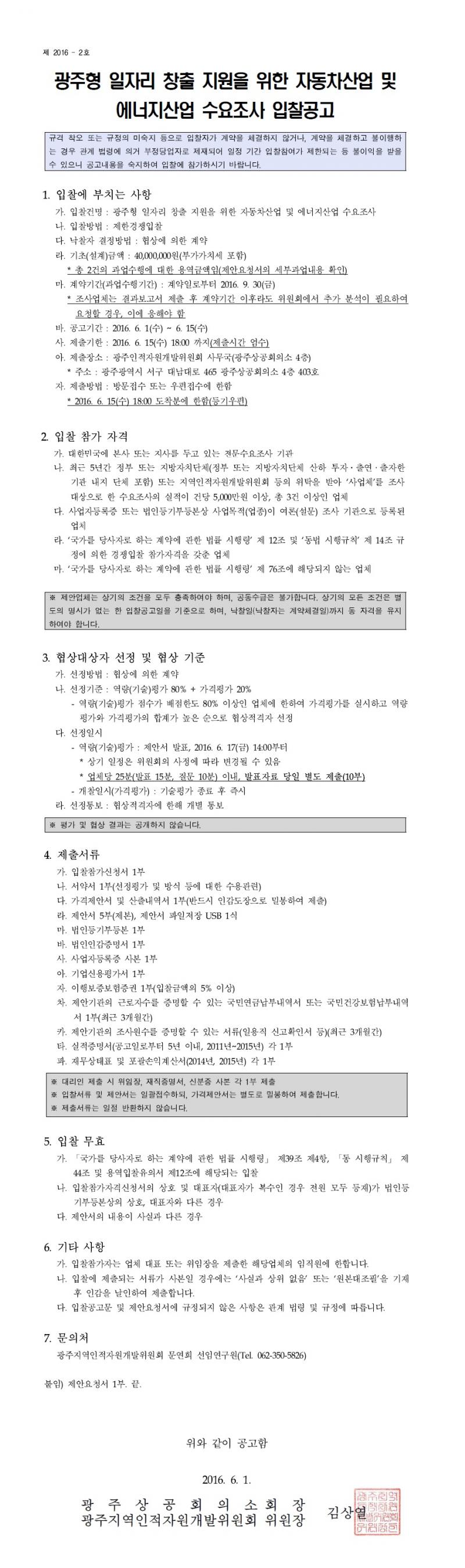 [제2016-2호] 광주형 일자리 창출 지원을 위한 자동차산업 및 에너지산업 수요조사 입찰공고