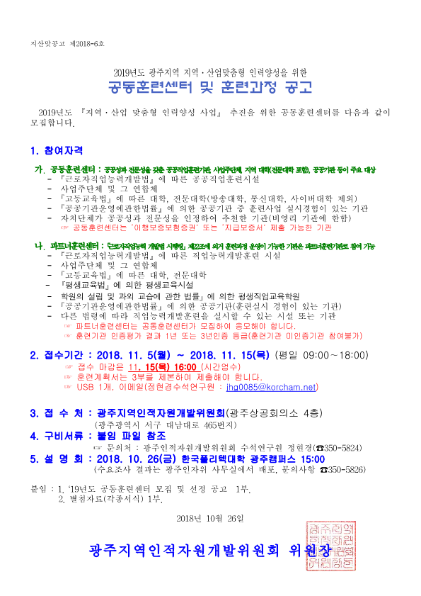 [제2018-6호] 2019년도 광주지역 지역․산업맞춤형 인력양성을 위한 공동훈련센터 및 훈련과정 공고