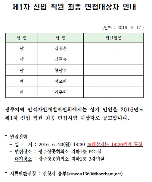 광주지역 인적자원개발위원회 제1차 신규 전담자 채용 최종면접대상자 안내