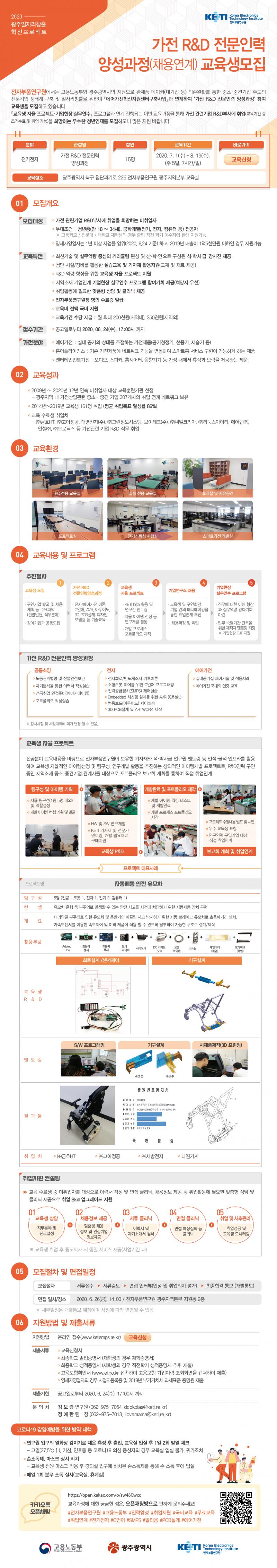 『교육생 자율 프로젝트 기업현장 실무연수』프로그램과 연계 진행되는 이번 교육과정을 통해 가전 관련기업 R&D부서에 취업(교육기간 중 조기수료 및 취업가능)을 희망하는 우수한 청년 인재를 모집하오니 많은 지원 바랍니다.