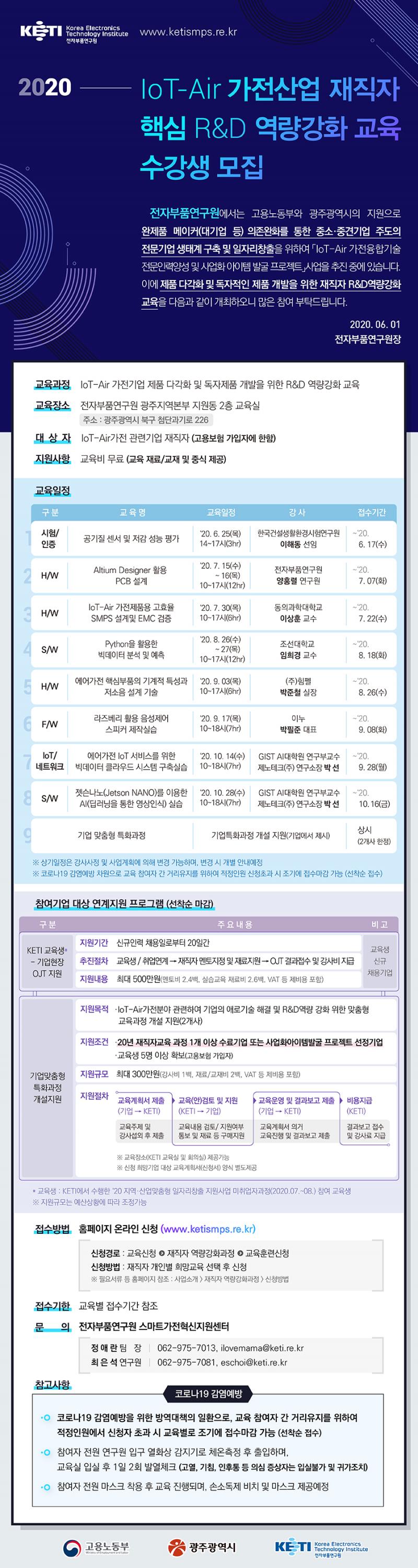 전자부품연구원에서는 고용노동부와 광주광역시의 지원으로 완제품 메이커(대기업 등) 의존완화를 통한 중소·중견기업 주도의 전문기업 생태계 구축 및 일자리창출을 위하여 『 IoT-Air 가전융합기술 전문인력양성 및 사업화 아이템 발굴 프로젝트』사업을 추진 중에 있습니다. 이에 제품 다각화 및 독자적인 제품 개발을 위한 재직자R&D역량강화 교육을 다음과 같이 개최하오니 많은 참여부탁드립니다.