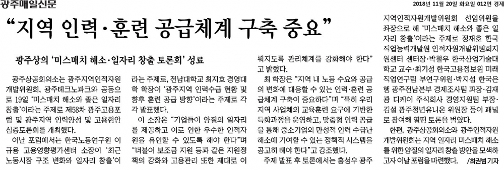 [2018.11.20] 광주매일신문 012면,“지역 인력·훈련 공급체계 구축 중요”