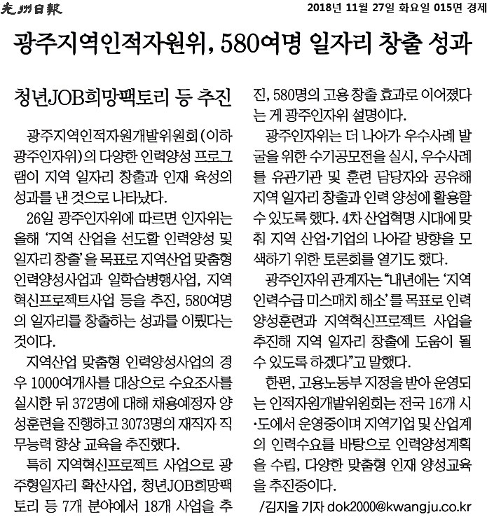 [2018.11.27] 광주일보 015면, 광주지역인적자원위, 580여명 일자리 창출 성과