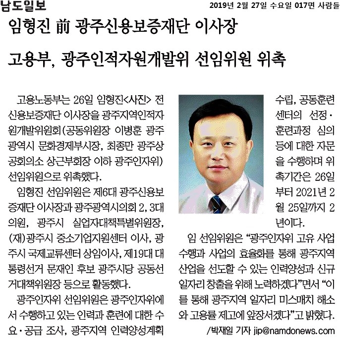 2019-02-27_남도일보_017면_임형진 前 광주신용보증재단 이사장 고용부, 광주인적자원개발위 선임위원 위촉.jpg : 0.40 M