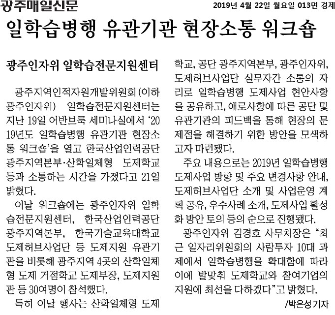 [2019.04.22] 광주매일신문_013면, 일학습병행 유관기관 현장소통 워크숍