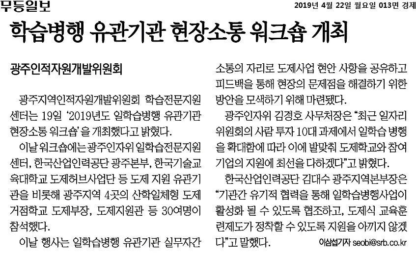 [2019.04.22] 무등일보_013면, 학습병행 유관기관 현장소통 워크숍 개최
