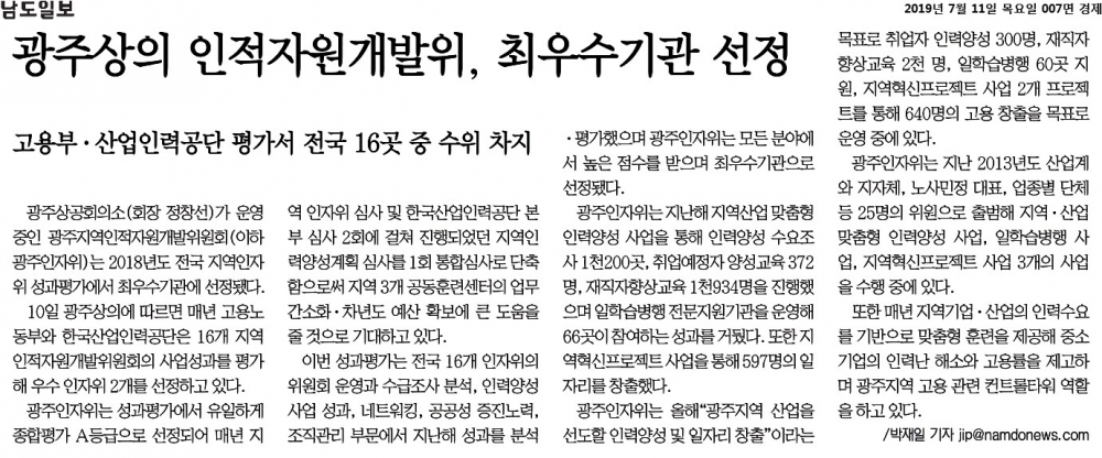[2019.07.11] 남도일보 007면, 광주상의 인적자원개발위, 최우수기관 선정