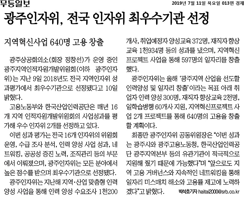 [2019.07.11] 무등일보 013면, 광주인자위, 전국 인자위 최우수기관 선정