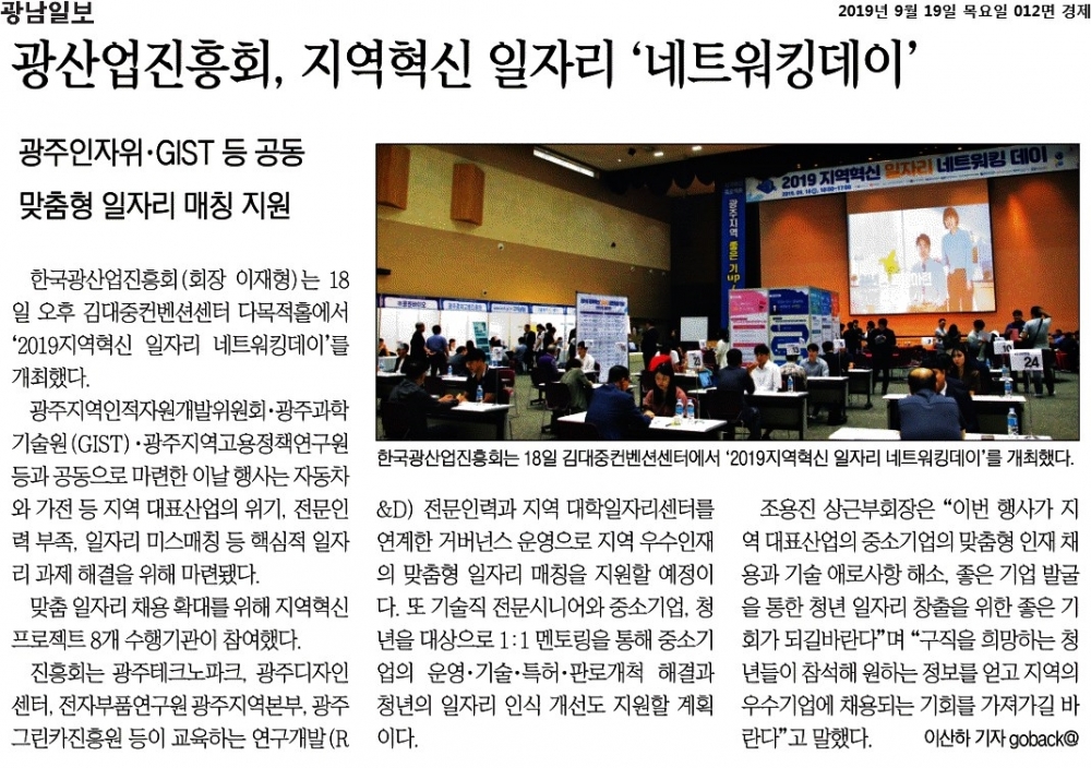 [2019.09.19] 광남일보 012면, 광산업진흥회, 지역혁신 일자리 네트워킹데이