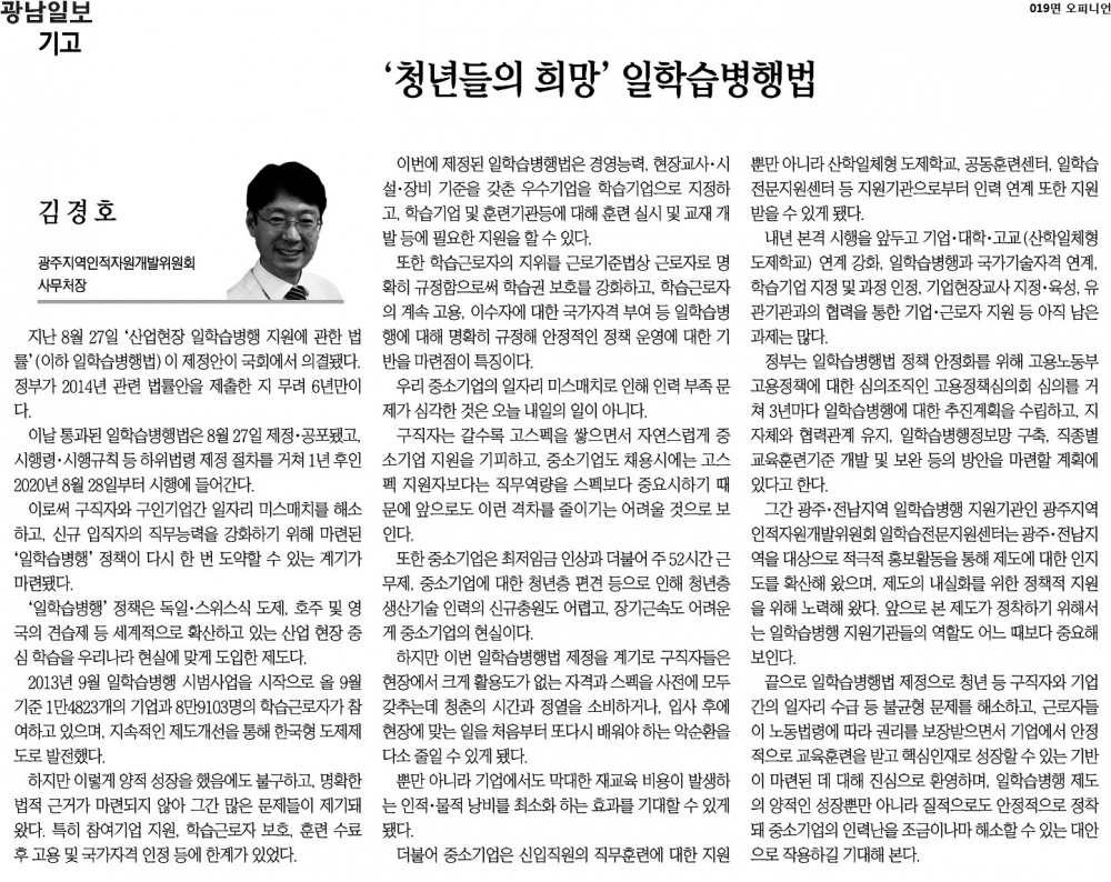 [2019.10.25] 광남일보 019면, 청년들의 희망 일학습병행법