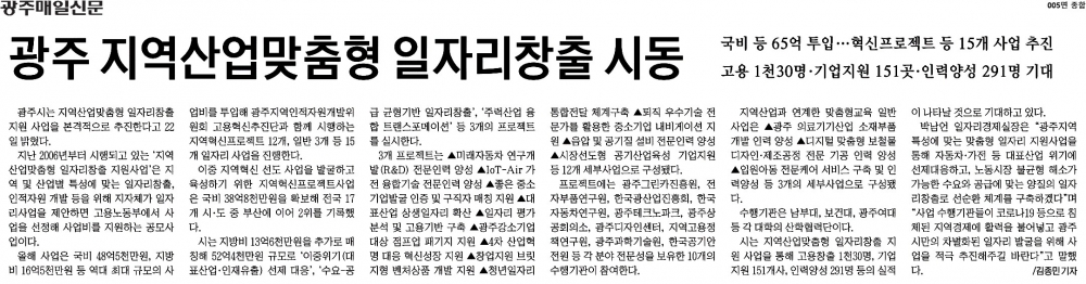 [2020.03.23] 광주매일신문 005면, 광주 지역산업맞춤형 일자리창출 시동