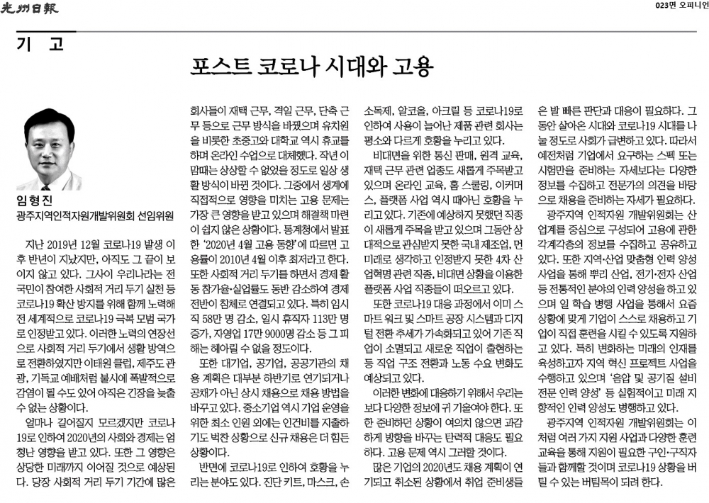 [2020.06.23] 광주일보 023면, 포스트 코로나 시대와 고용(임형진 선임위원 기고)