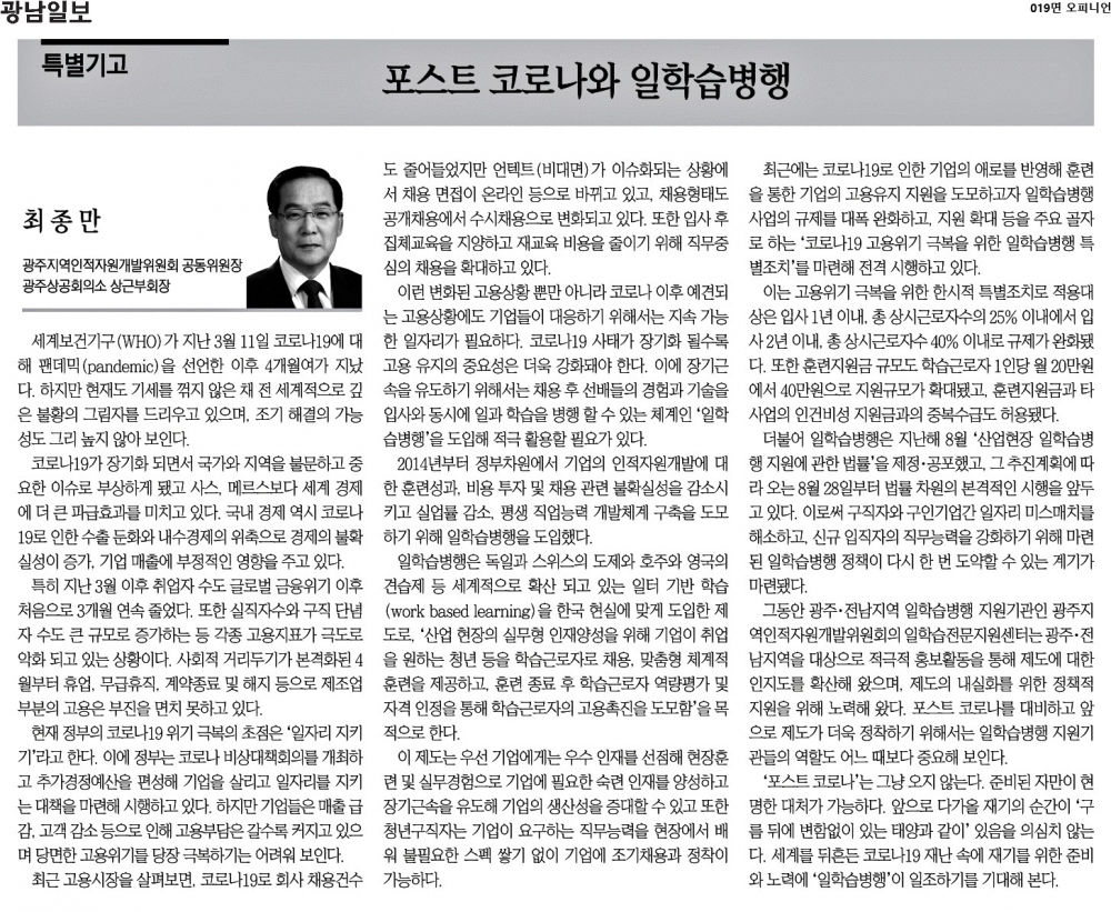 [2020.07.29] 광남일보 019면, 포스트 코로나와 일학습병행
