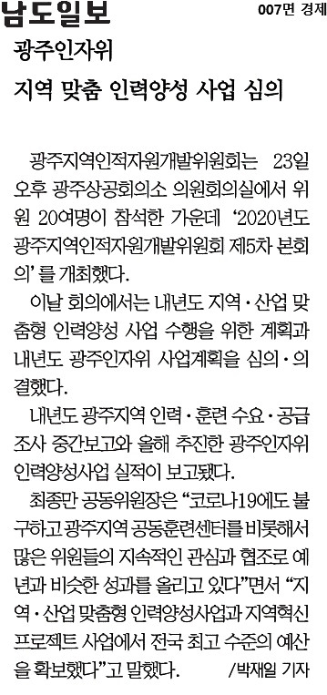 [2020.11.24] 남도일보 007면, 광주인자위 지역 맞춤 인력양성 사업 심의