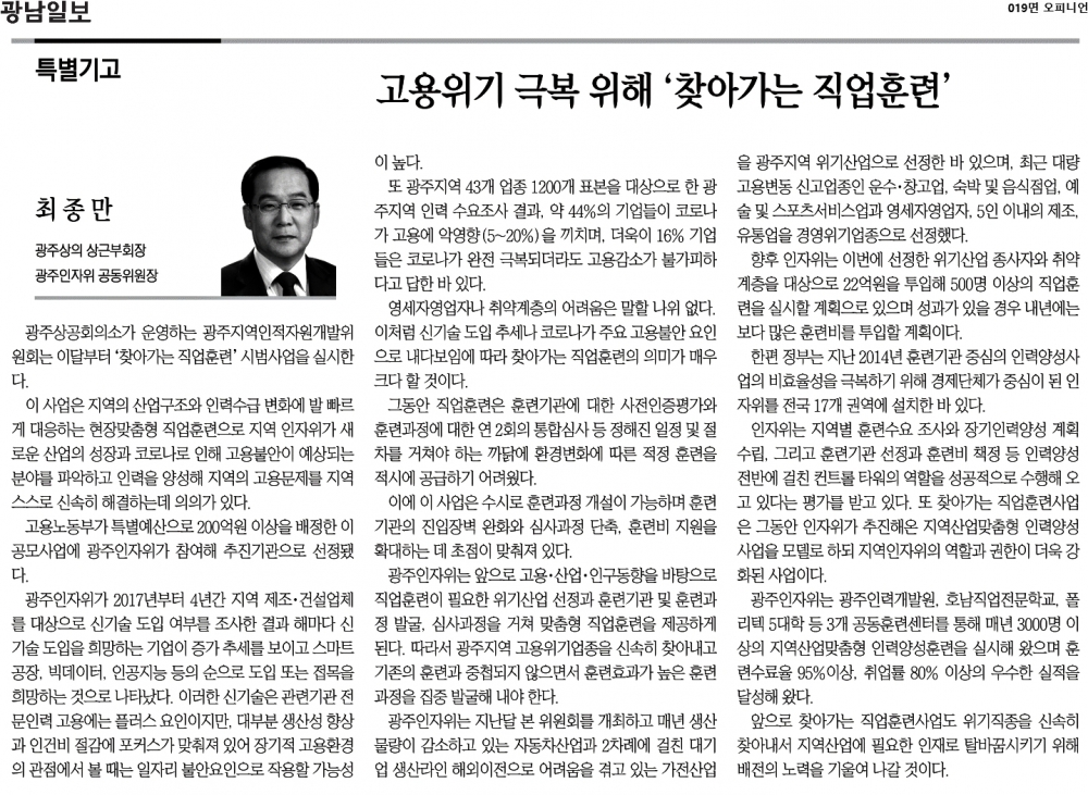 [2021.05.26] 광남일보 019면, 고용위기 극복 위해 찾아가는 직업훈련(최종만 위원장 기고)