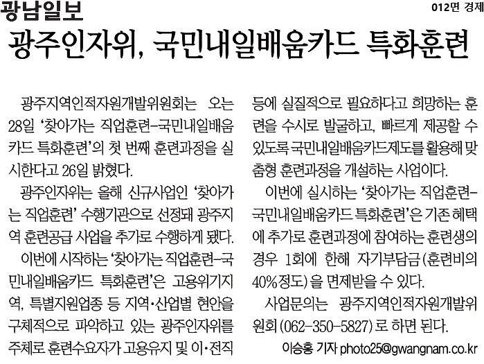 [2021.07.27] 광남일보, 광주인자위, 국민내일배움카드 특화훈련