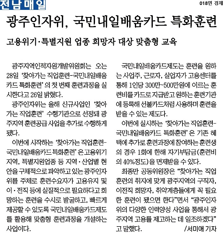 [2021.07.27] 전남매일, 광주인자위, 국민내일배움카드 특화훈련