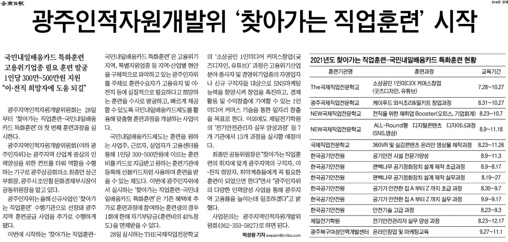 [2021.07.27] 전남일보 014면, 광주인적자원개발위 찾아가는 직업훈련 시작