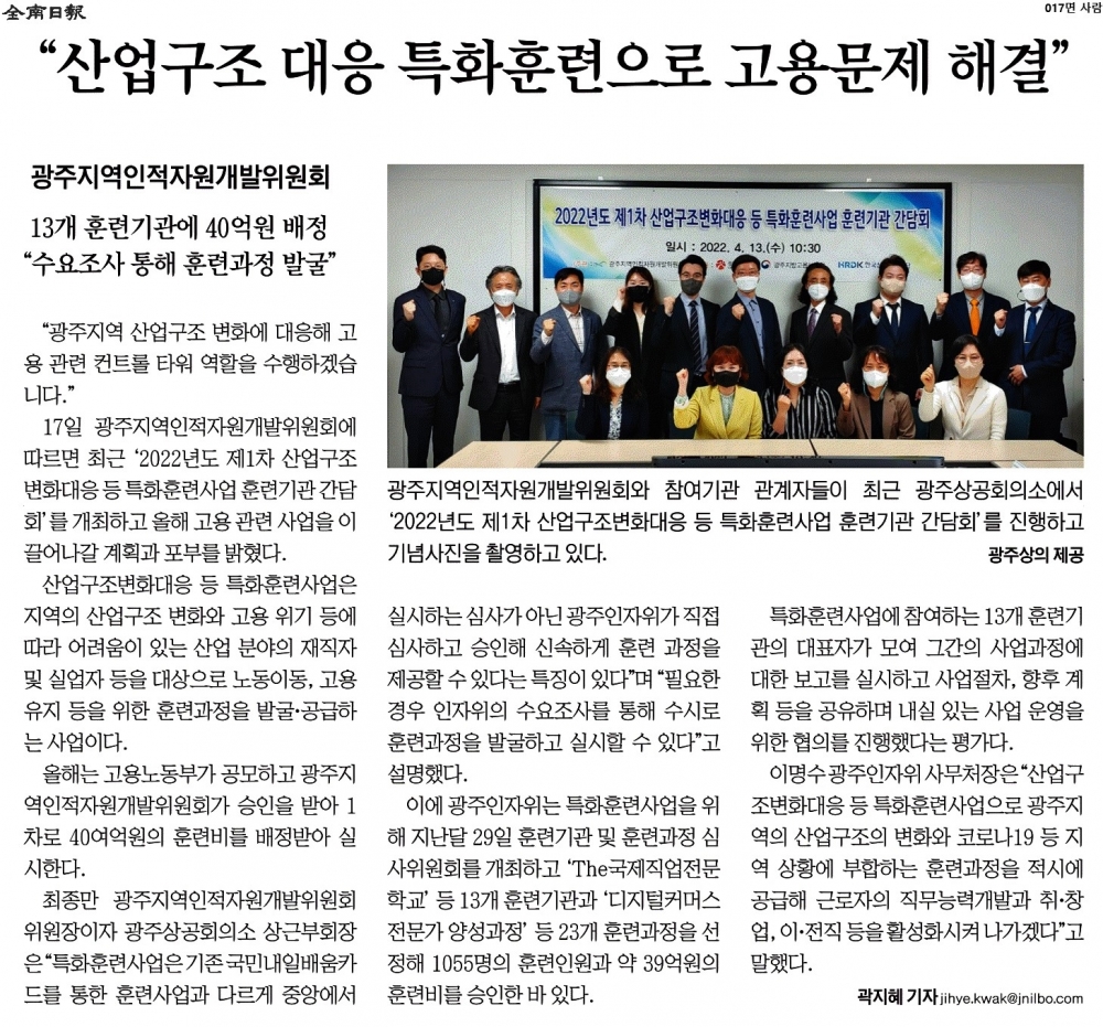[2022.04.18.] 전남일보 017면, 산업구조 대응 특화훈련으로 고용문제 해결
