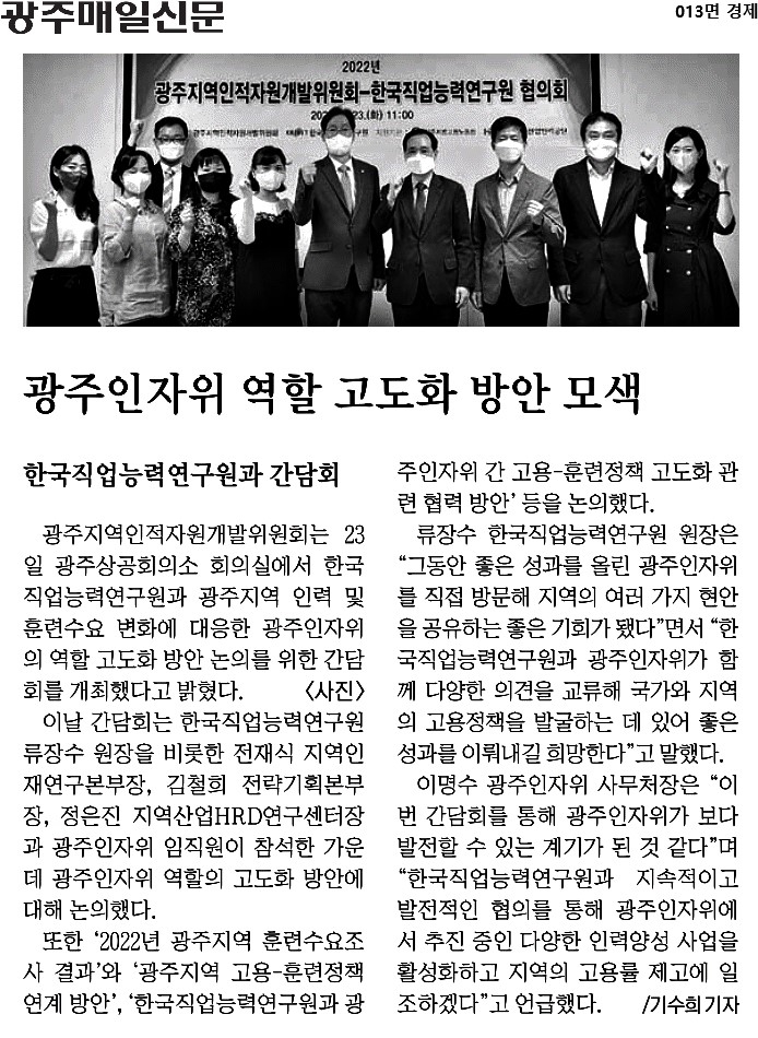 [2022.08.24.] 광주매일신문 013면 광주인자위 역할 고도화 방안 모색