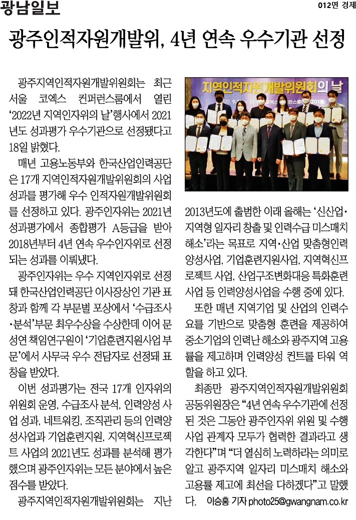 [2022.09.19.] 광남일보 012면, 광주인적자원개발위, 4년 연속 우수기관 선정