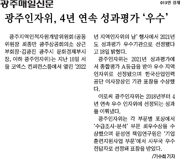 2022-09-19_광주매일신문_013면_광주인자위, 4년 연속 성과평가 ‘우수’.jpg : 0.22 M