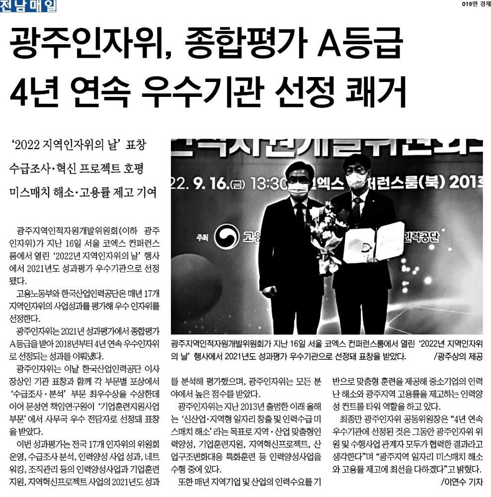 [2022.09.19.] 전남매일 019면, 광주인자위, 종합평가 A등급 4년 연속 우수기관 선정 쾌거