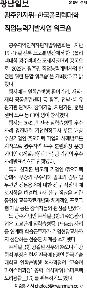 [2022.11.17.] 광남일보 13면, 광주인자위-한국폴리텍대학 직업능력개발 사업 워크숍