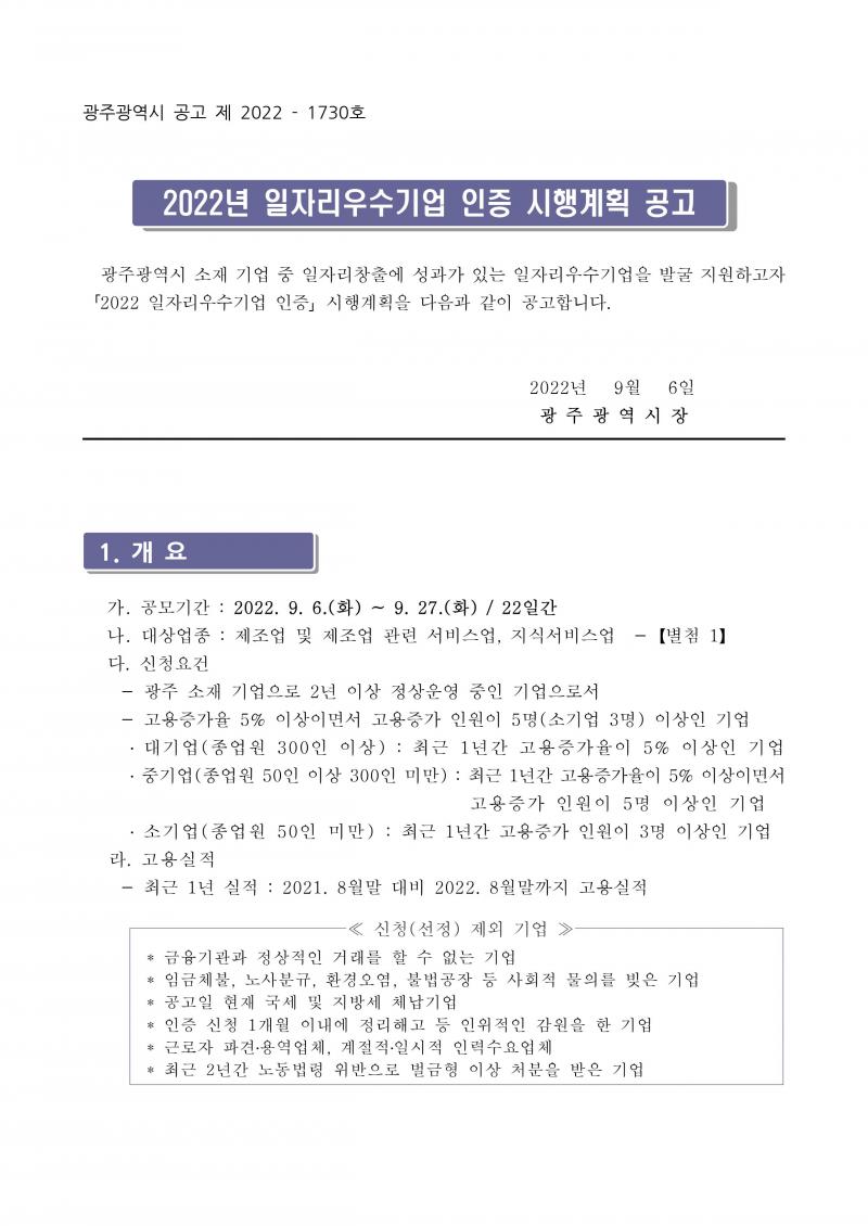 (타기관공고-광주광역시) 2022년 일자리 우수기업 인증 시행계획 공고