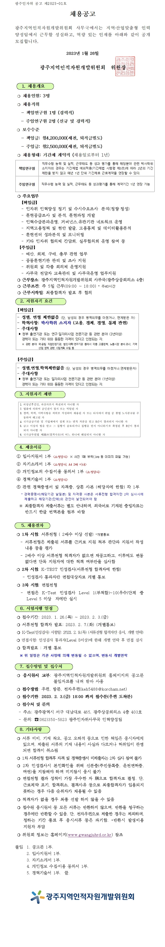 [광주인자위 제2023-01호] 2023년 직원 채용 공고(지역·산업맞춤형 인력양성 사업 전담자)