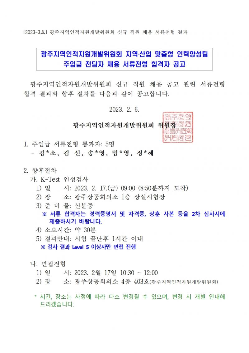 [광주인자위 제2023-03호] 광주지역인적자원개발위원회 신규 직원 채용 서류전형 결과 안내