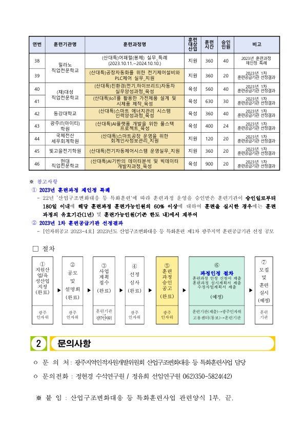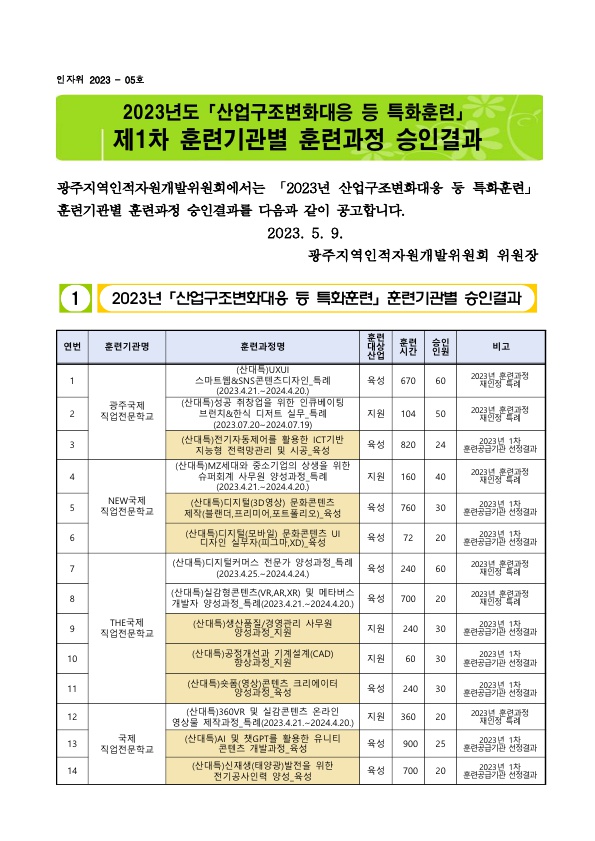 [인자위공고 2023-05호] 2023년도 제1차 산업구조변화대응 등 특화훈련 훈련기관별 훈련과정 승인결과