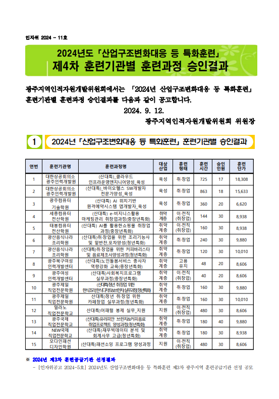 [인자위공고 2024-11호] 2024년도 제4차 산업구조변화대응 등 특화훈련 광주지역 훈련공급기관 선정 공모