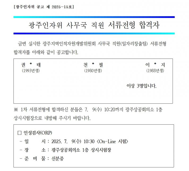[인자위 공고 제2025-15호] 광주인자위 사무국 서류전형 합격자 공고