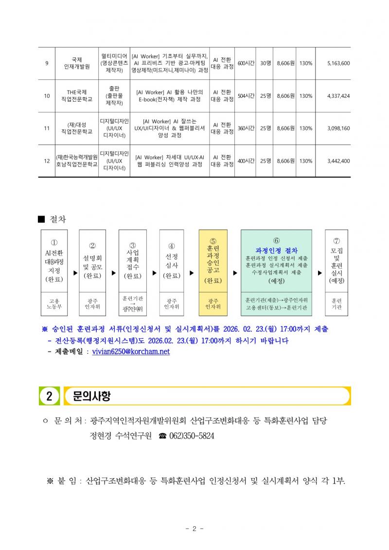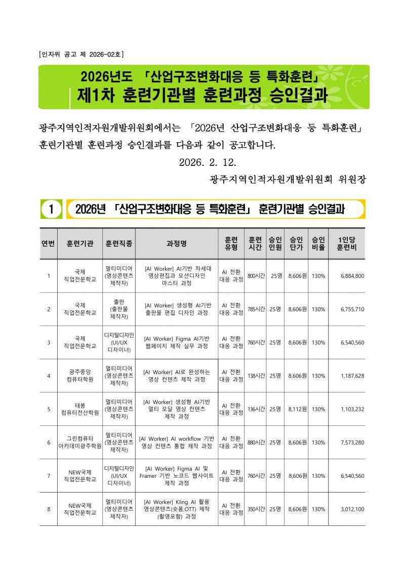 [인자위공고 2026-02호] 2026년도 제1차 산업구조변화대응 등 특화훈련사업 훈련기관별 훈련과정 승인 결과
