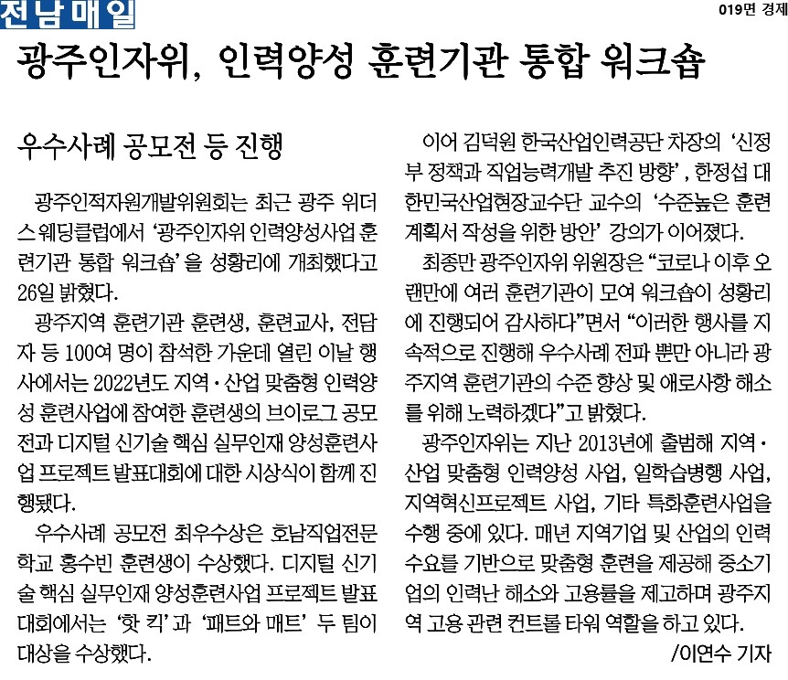 [2022.12.27.] 전남매일 19면, 광주인자위, 인력양성 훈련기관 통합 워크숍