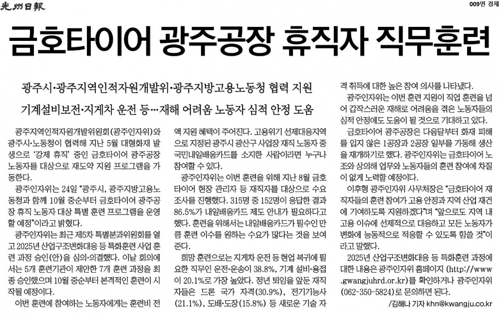 [2025.09.25.] 광주일보 9면, 금호타이어 광주공장 휴직자 직무훈련