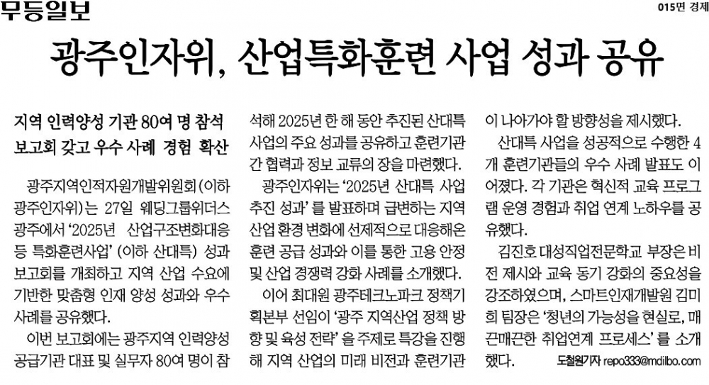 [2025.11.28.] 무등일보 15면, 광주인자위, 산업특화훈련 사업 성과 공유