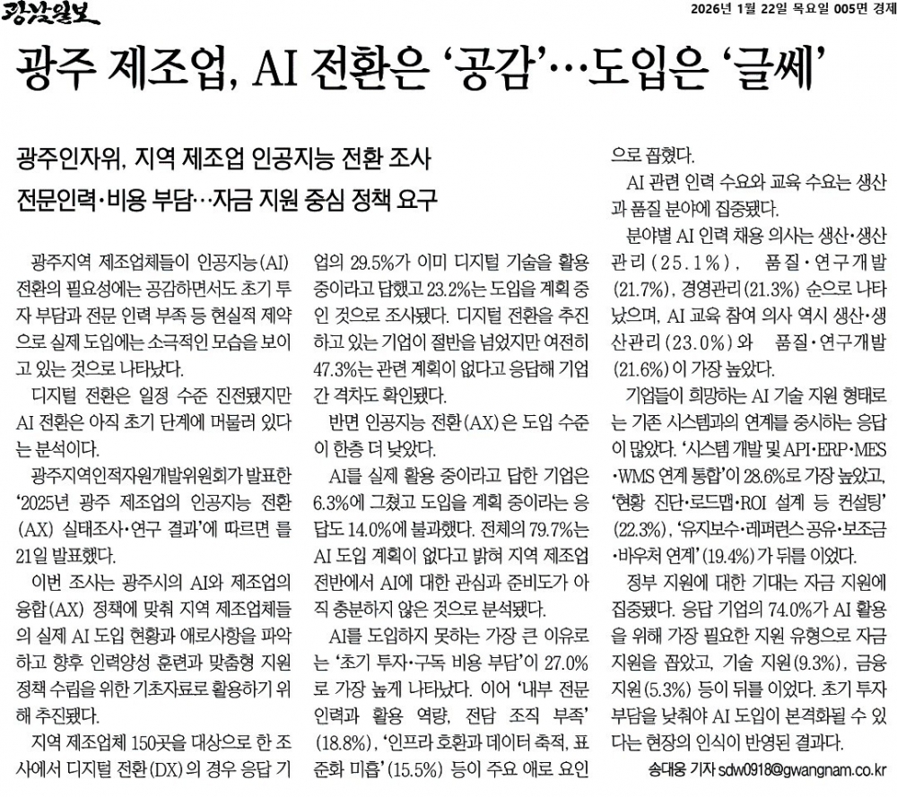 [2026.01.22.] 광남일보 5면, 광주 제조업, AI 전환은 공감 …도입은 글쎄