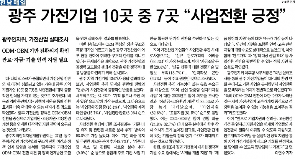 [2026.01.28.] 전남매일 18면, 광주 가전기업 10곳 중 7곳 사업전환 긍정